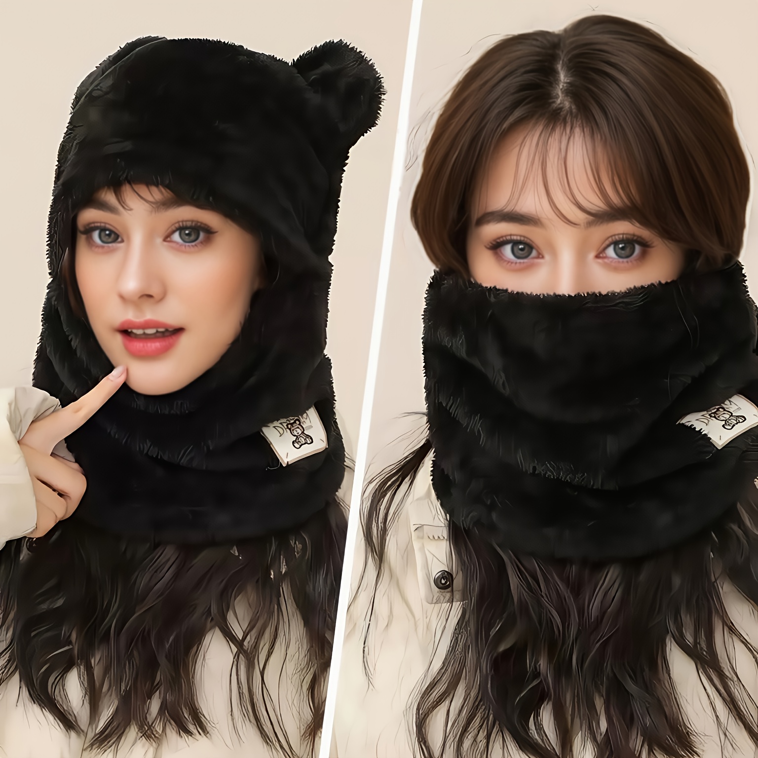 TEMU 여성용 겨울 곰 후드 마스크 & 모자 - 부드러운 갈색 퍼 텍스처, 방풍 및 방한 기능, 얼굴 개방형 탄력, 스키, 스노보드, 일상 추위 대비를 위한 포근한 겨울 코스튬 액세서리 - 귀여운 곰 귀 & 편안한 핏, 곰 모자