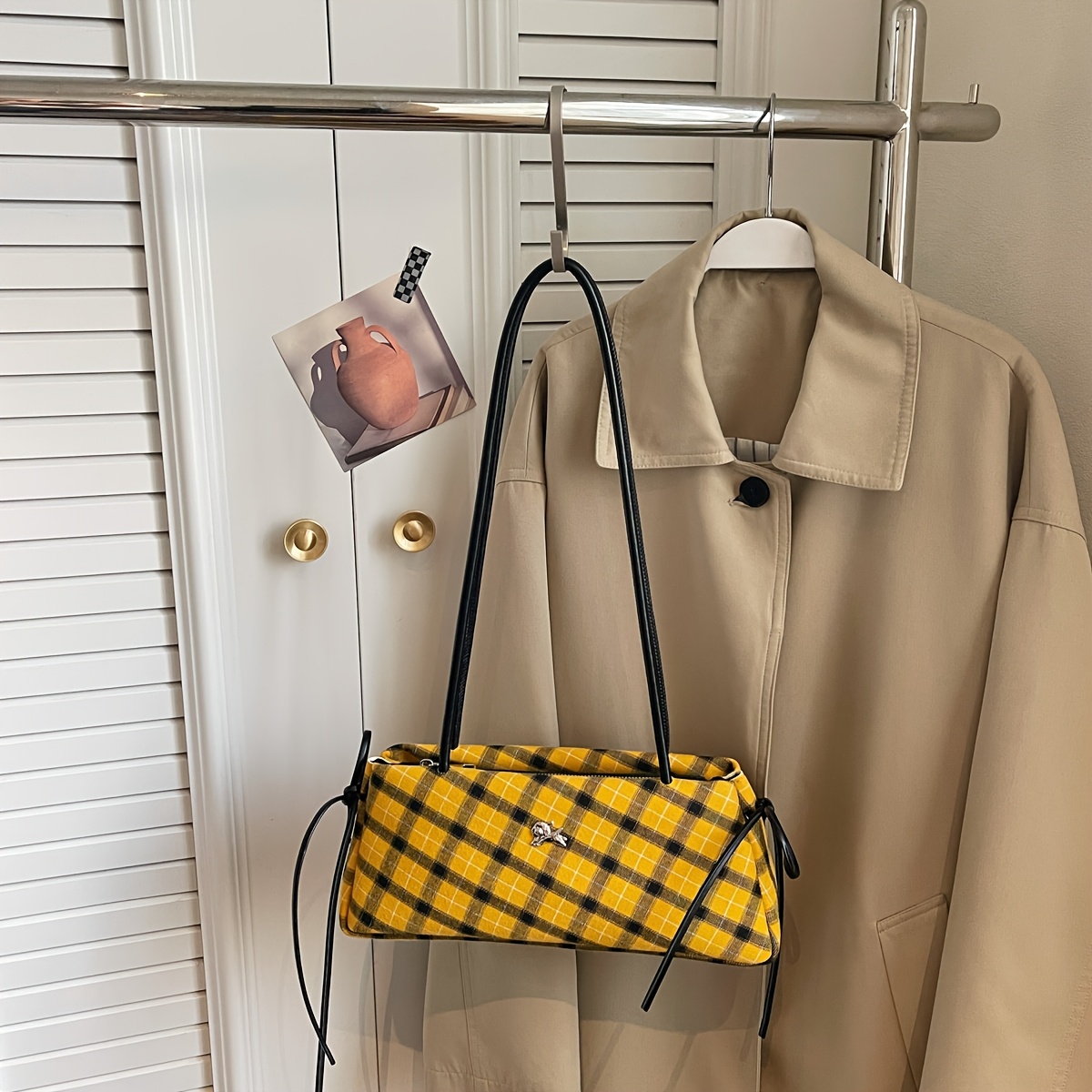 TEMU 새로운 달콤하고 멋진 매운 독점 체크 무늬 여성 숄더백, 가방 양쪽에 묶인 리본 장식이 있습니다. 달콤하고, 검정과 노란색 체크는 눈에 띄고 밝으며, 생기와 활기를 보여줍니다. 노란색과 회색 체크는 낮고 우아합니다.