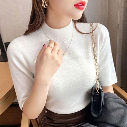 [셀러허브_여성트랜드패션]ONM 여자 5컬러 하프넥 슬림 5부 반팔 골지티 니트티셔츠