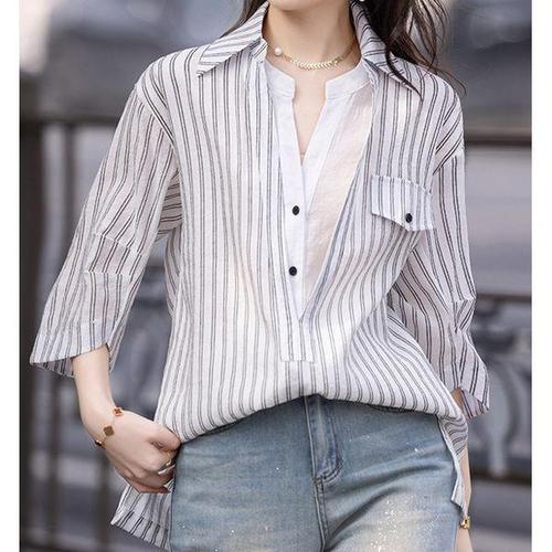 [패션시그널]레이어드셔츠넥 5부소매 블라우스 7CC4EB