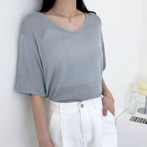 [에이치플러스몰]여성 브이넥 여리핏 5부 반팔니트 체형커버 데일리룩