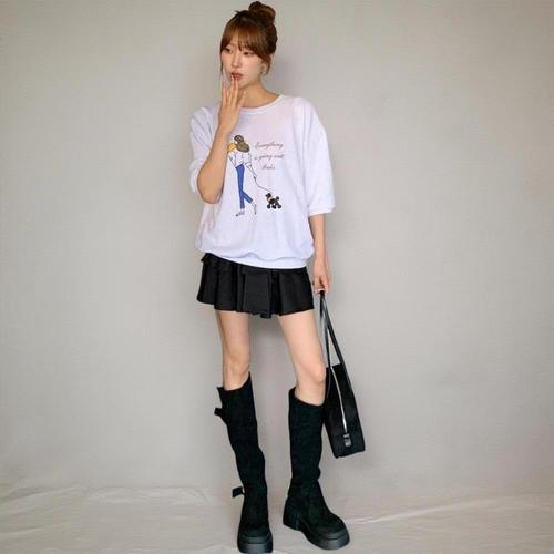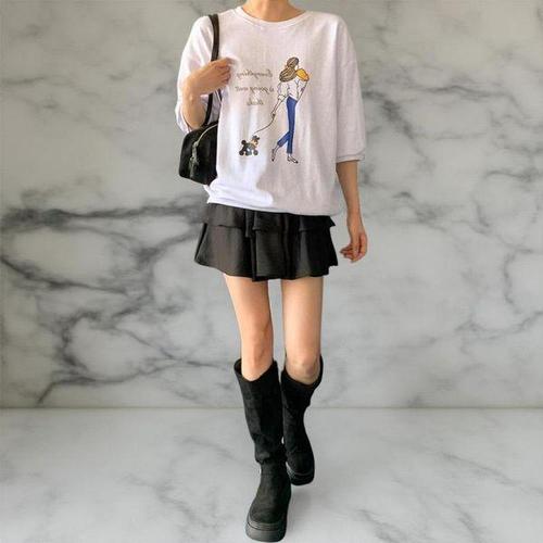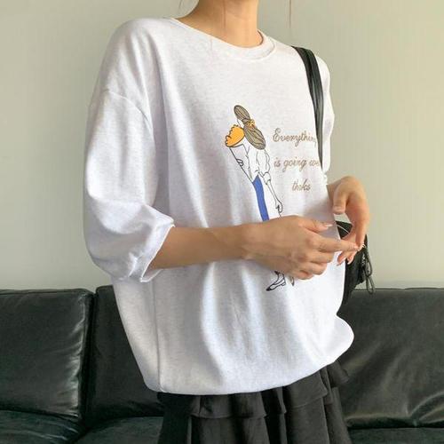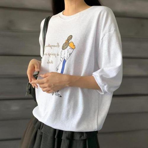 [옷자락]여성 키치무드 프린트 면 라운드넥 7부 티셔츠