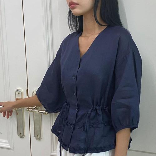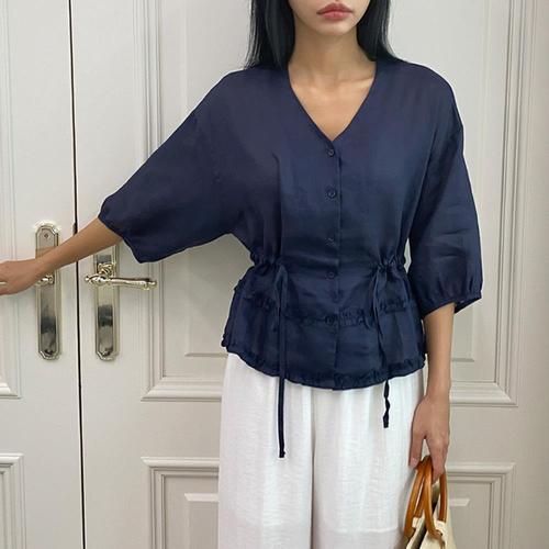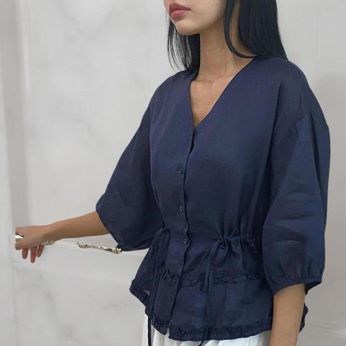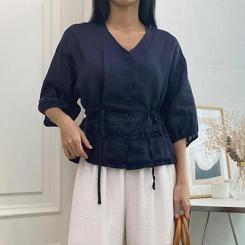 [옷자락] 여성 클래식 린넨 브이넥 7부 스트링 프릴 블라우스