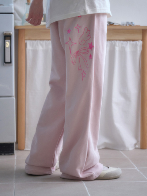 [엠블러] 엠블러 남여공용 Angel And Ribbon 자수 핀턱 2-Way 와이드 트레이닝 스웨트 팬츠 AP1002-핑크