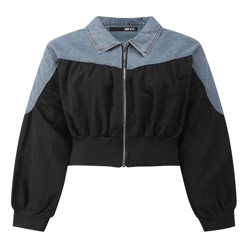 [비엔엑스]데님 배색 셔링 카라넥 밴딩 집업 점퍼 (BW3JP003L0)