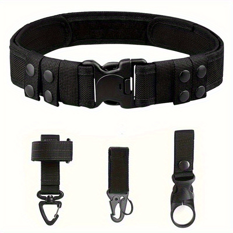 TEMU 튼튼한 옥스포드 천 웨빙으로 제작된 남성용 택티컬 벨트 4종 세트. 퀵 릴리스 버클, 수납 클립, 키체인, 물병 홀더가 특징이며, 야외 사냥에 적합합니다.