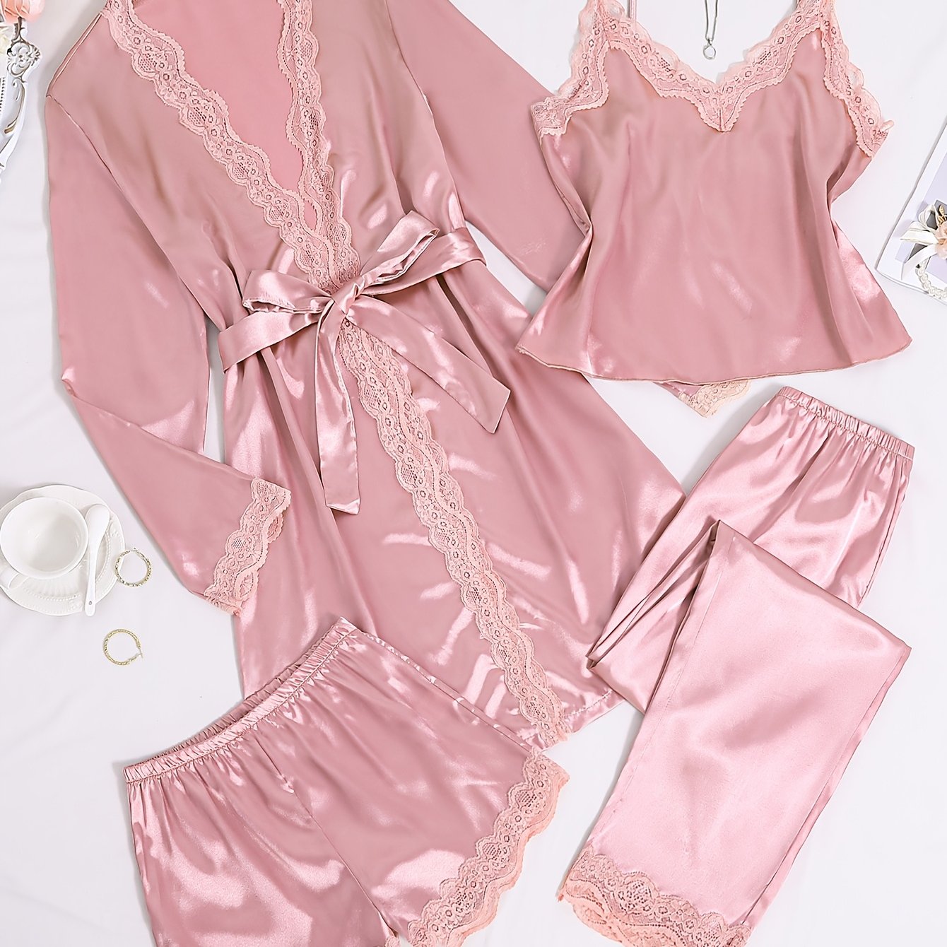 TEMU 여성용 우아한 편안함 솔리드 컬러 레이스 스파게티 스트랩 + 반바지 + 긴 바지 + 나이트가운 홈 세트 4피스