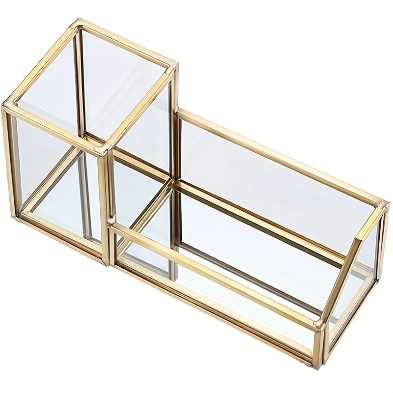 TEMU 펜/연필 홀더가 있는 유리 명함 홀더 - 우아한 골드 메탈 데스크 정리함, 컴팩트 & 휴대용 디자인, 사무실, 가정, 여행용 2구 카드 보관 - 내구성이 뛰어난 유리 구조, 사무용품 | 모던 데스크 액세서리 | 튼튼한 유리