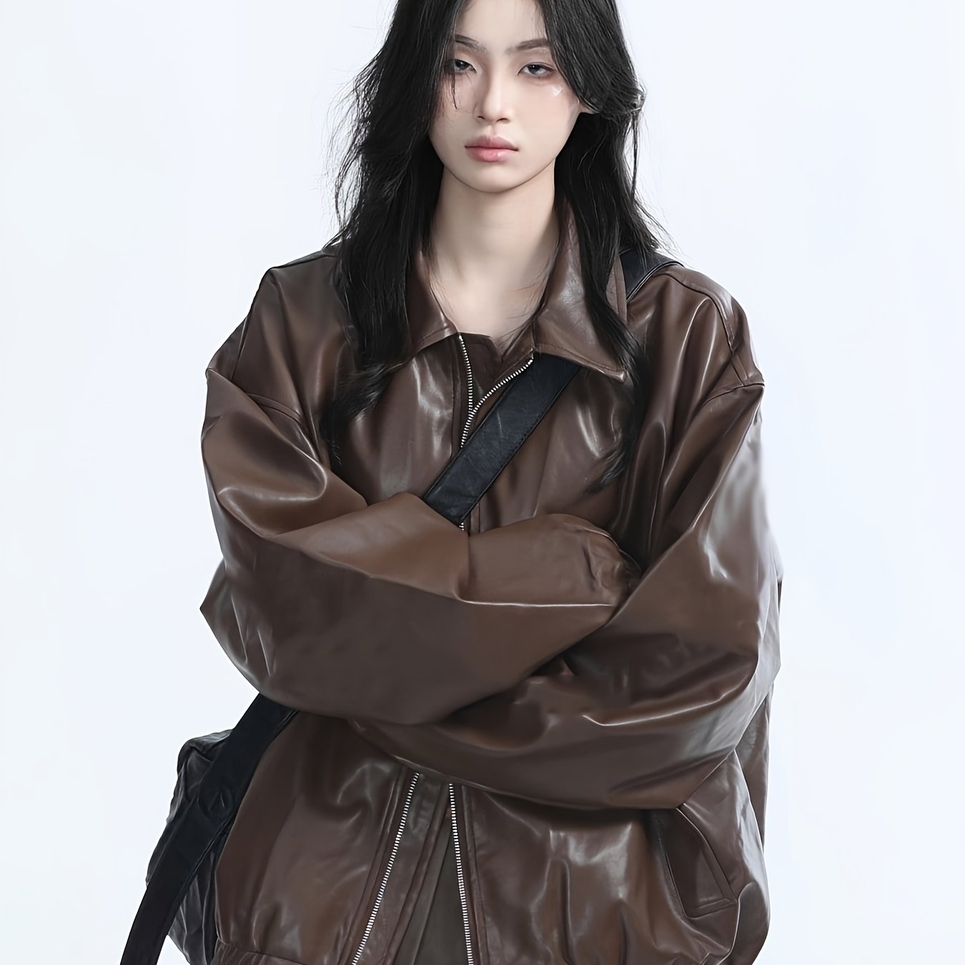 TEMU 2025년 신상 마일라드 브라운 여성용 PU 자켓, 가을 아메리칸 빈티지 루즈핏 자켓, 트렌디한 캐주얼 자켓, 여성용 심플 아우터웨어