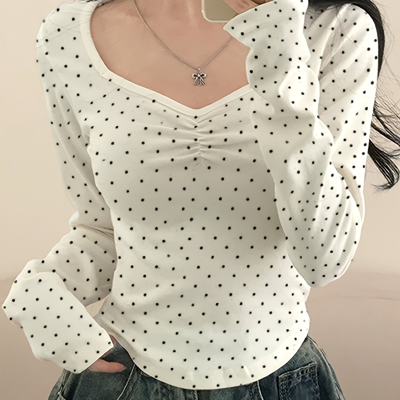 TEMU 여성용 다용도 및 간편한 기본 반팔 상의, V넥 디자인, 대비되는 색상의 물방울 무늬와 플리츠가 특징입니다.|반팔니트