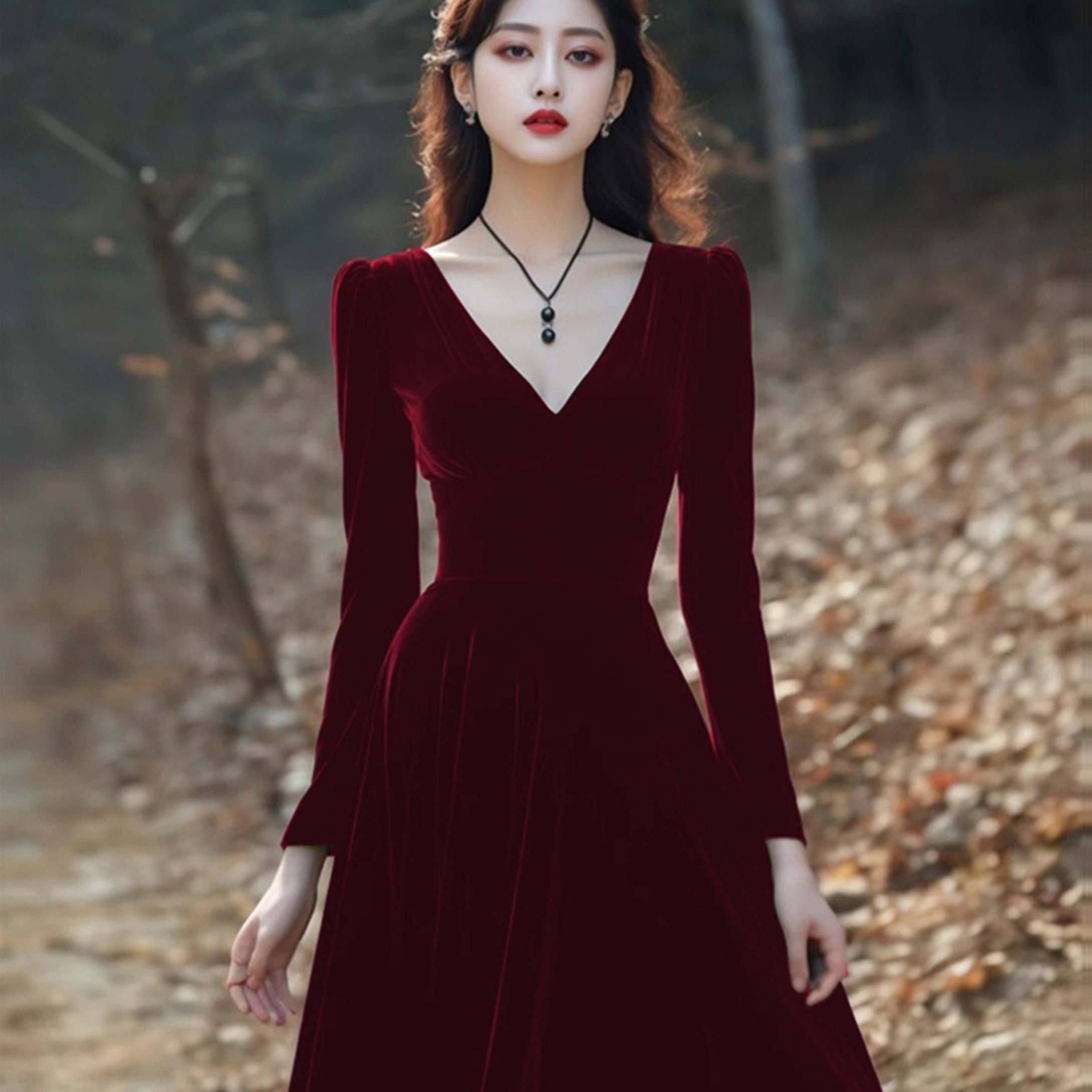 TEMU 버건디 레드 벨벳 드레스 - A라인 - 슬림핏 허리 디자인, 기계 세탁 가능 겨울 웨딩 게스트 드레스, 프롬 & 갈라 이브닝 파티 의상 (럭셔리 사계절 착용)