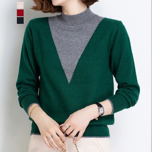 [퀸이즈] 리타 브이라인 배색 반목 니트 티셔츠
