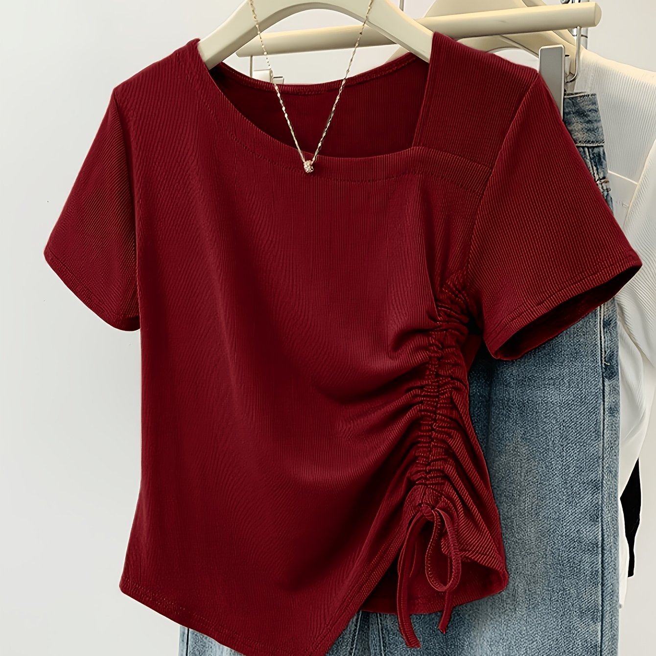 TEMU 방향성 BK260108038 여름 신상 불규칙 디자인 드로스트링 반팔 티셔츠 캐주얼 단색 탑