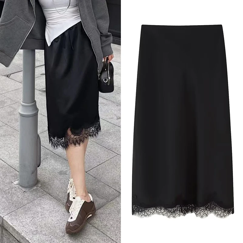 블랙 레이스 패널 헴 드레이프 컷 실크 새틴 스커트 우아한 파티 데이트 의상 여성 패션 스커트 바텀 트라피자란