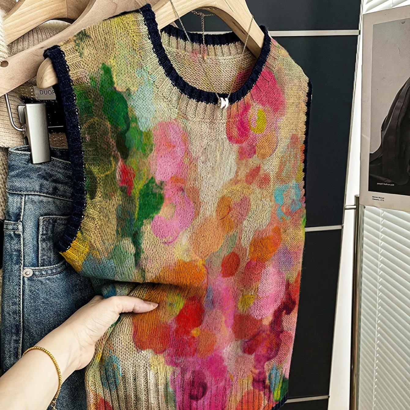 TEMU 우아한 플로럴 프린트 타이 다이 베스트 | 여성용 캐주얼 및 다용도 크루넥 민소매, 컬러 블록 디테일, 카키색