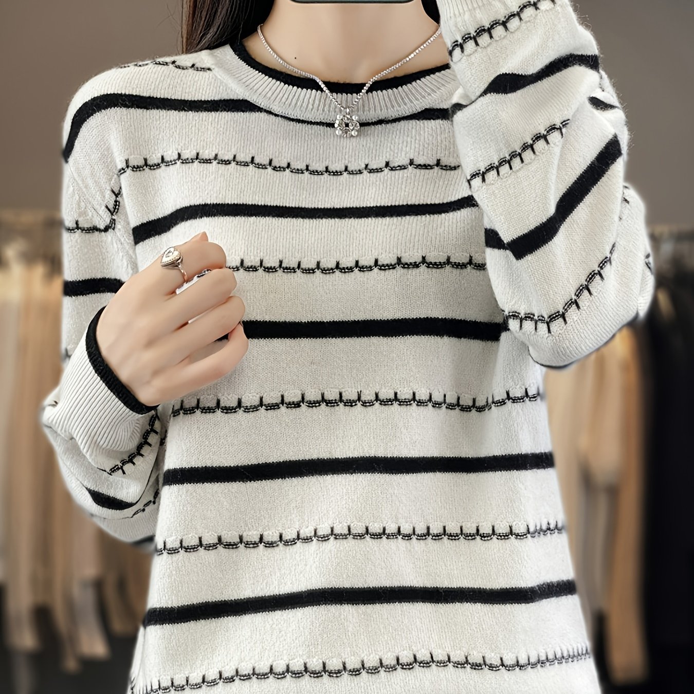 TEMU 여성 캐주얼 크루넥 롱슬리브 니트 스웨터, 비즈 디테일, 비스코스 블렌드 풀오버 상의, 일반 길이, 350g/m² 중간 신축성 원단, 모든 계절