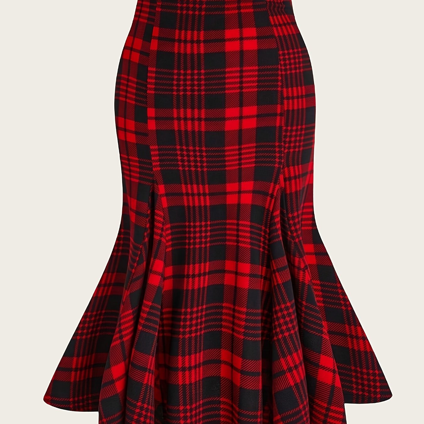 TEMU 여성용 우아한 크리스마스 체크 메리디언 미니 드레스 - 레드 & 체크 스커트, 퍼프 소매, 올 시즌 파티 & 포멀 이벤트 의상, 크리스마스 드레스, 축제 의상, 쇼핑객