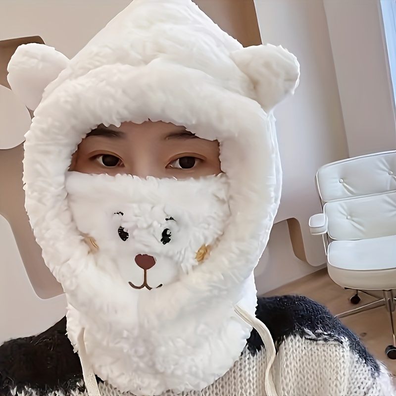 TEMU 코지 베어 모자 - 부드럽고 따뜻한 겨울 모자, 드로스트링 잠금, 귀여운 곰 얼굴 디자인, 가볍고 따뜻하여 야외 및 일상 사용에 적합, 할로윈 및 가을/겨울 활동에 완벽, 곰 모자, 할로윈 액세서리, 장난기 넘치는 디자인