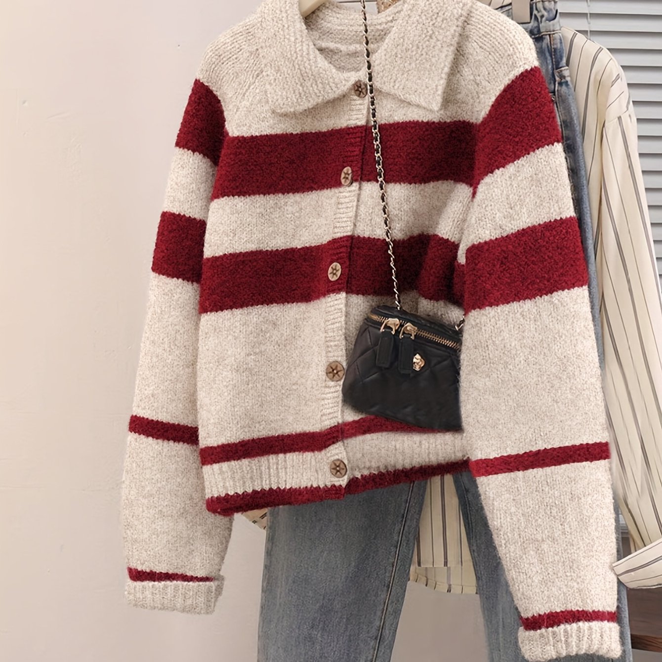 TEMU 2025 가을/겨울 신상 컬러블록 칼라 스웨터 가디건 여성용, 빈티지 컬러 팔레트의 두꺼운 루즈 레이지 가디건, 컬러블록 시스루 긴팔 가디건