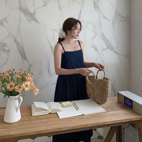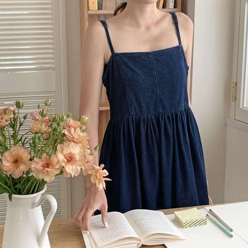 |CHO59D2|여성 오버사이즈 스모크 밴딩 끈 나시 데님 롱 드레스