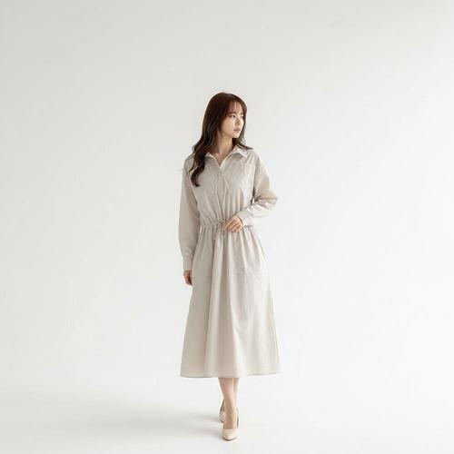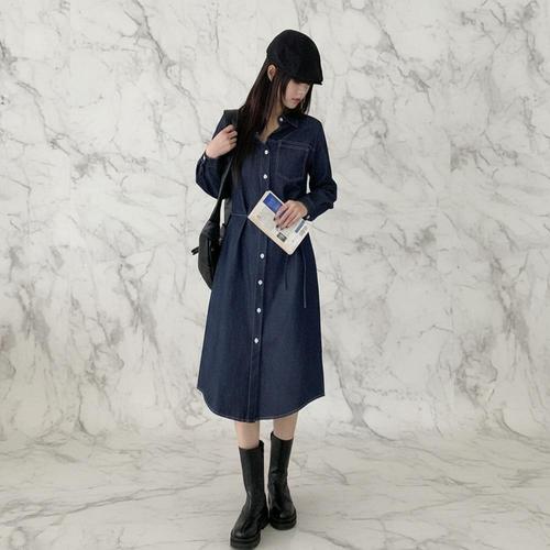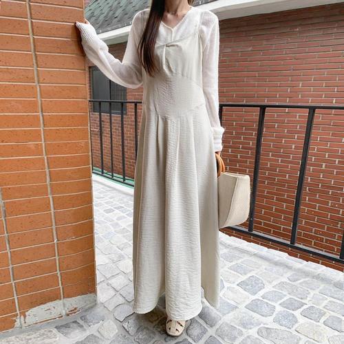 |CHO594C|여성용 봄가을 바스락 소리 나는 스트링 포켓 긴 원피스