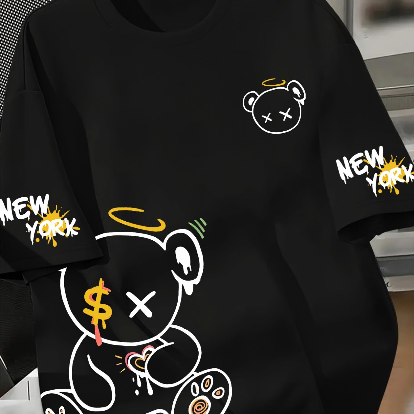 TEMU 남성용 100% 폴리에스터 티셔츠, 캐주얼 다용도 베이스 레이어, 편안한 운동복 상의, 귀여운 곰돌이 패턴