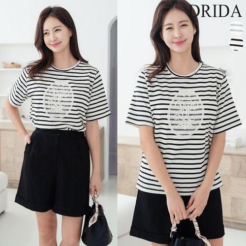 [드리다]여자 여름 스트라이프 단가라 레이스 면 빅사이즈 반팔 티셔츠 40-50대 캐주얼 엄마옷 등원 나들..