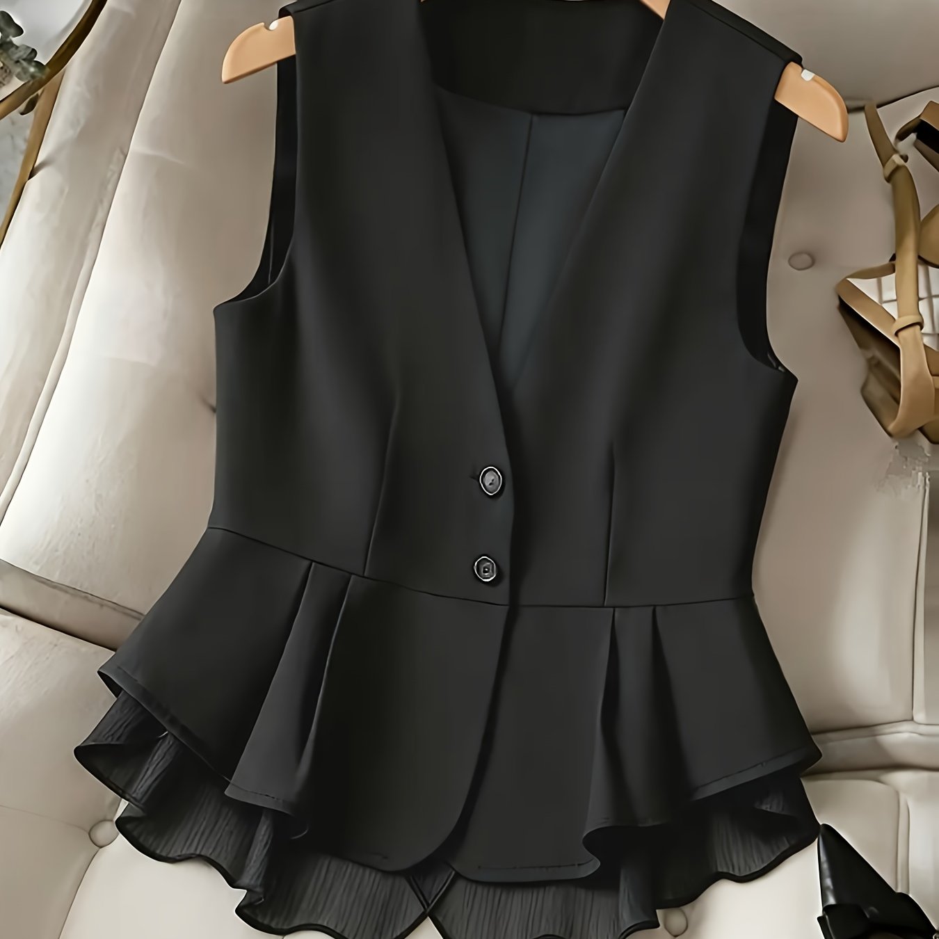 TEMU 여성을 위한 우아한 단색 조끼, 통근에 적합하며 발렌타인데이 및 크리스마스에 로맨스를 담아내는 스타일리시한 제품. 플리츠와 대각선 버튼과 V넥이 특징이며, 비대칭 디자인을 갖추고 있습니다.