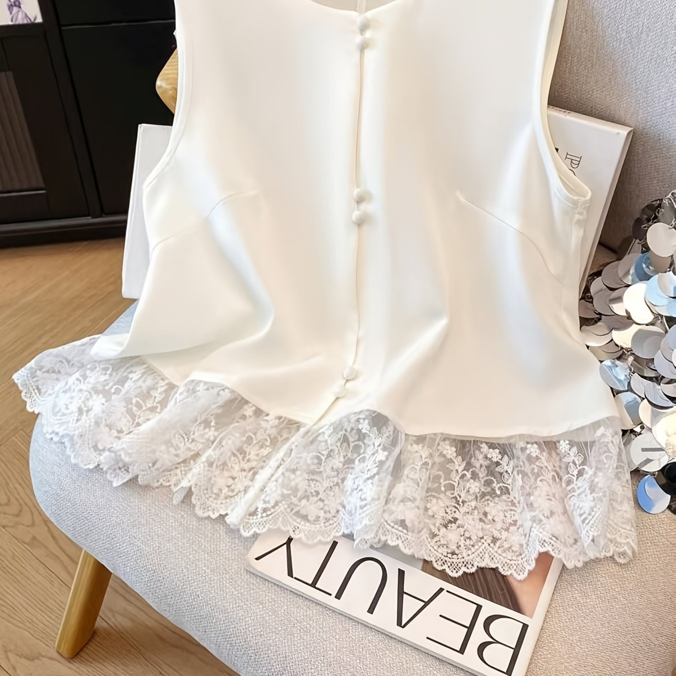 TEMU 사계절용 베스트, 라운드넥 진주 루즈핏 새틴 조끼, 캐주얼하고 우아함, 외출, 통근, 집, 파티에 적합, 여성 의류