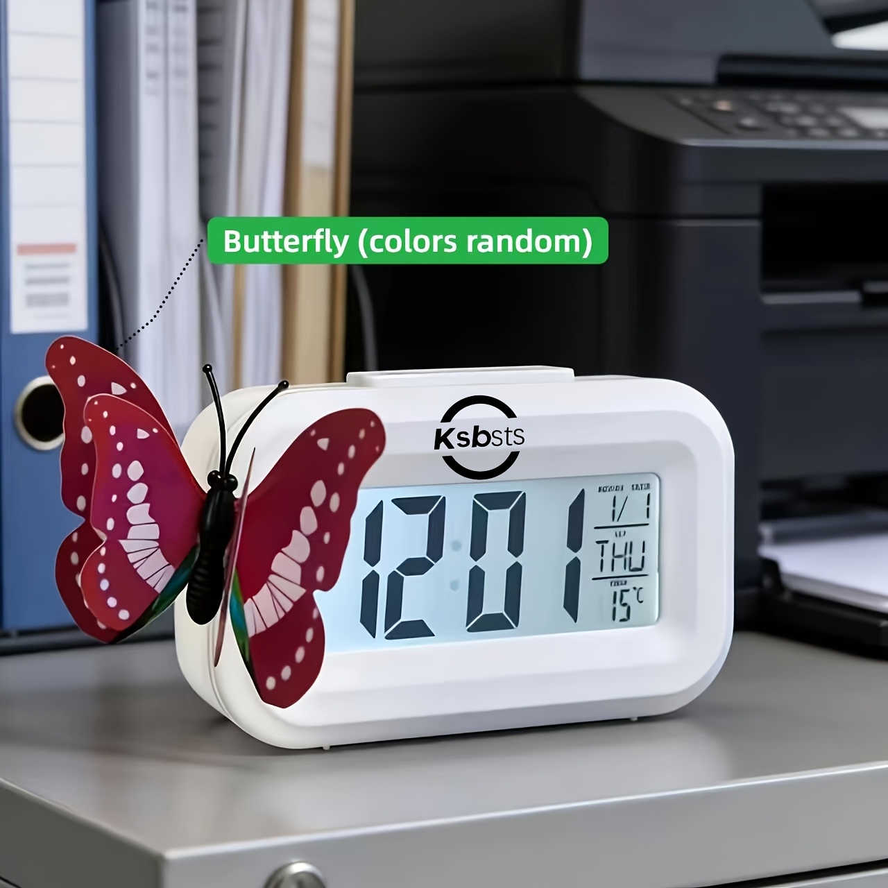 TEMU 큰 소리 알람 시계, 시계/날짜/온도 3-in-1 다기능 사무실 출석 알람 시계, 야광 온도 달력 타이머가 있는 다기능 시계, 랜덤 3D 나비 장식, 기숙사 및 침실에 적합한 데스크탑 장식