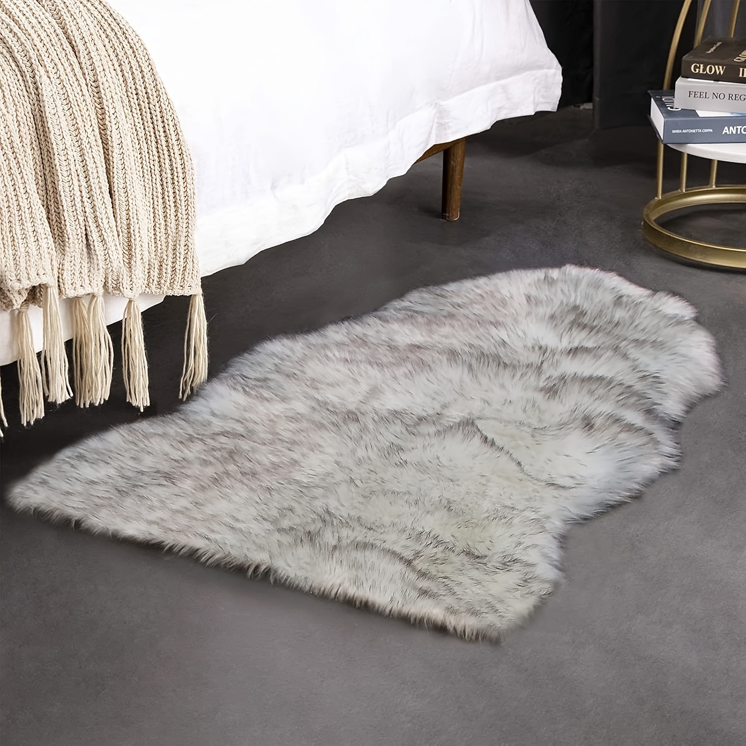 TEMU 인조 에리어 러그, 푹신하고 두꺼운 플러시 흰색-회색 끝단 비정형 양가죽 러그, 침실 침대 옆, 바닥, 거실용 매우 부드러운 기계 세탁 가능 샤ギ 매트