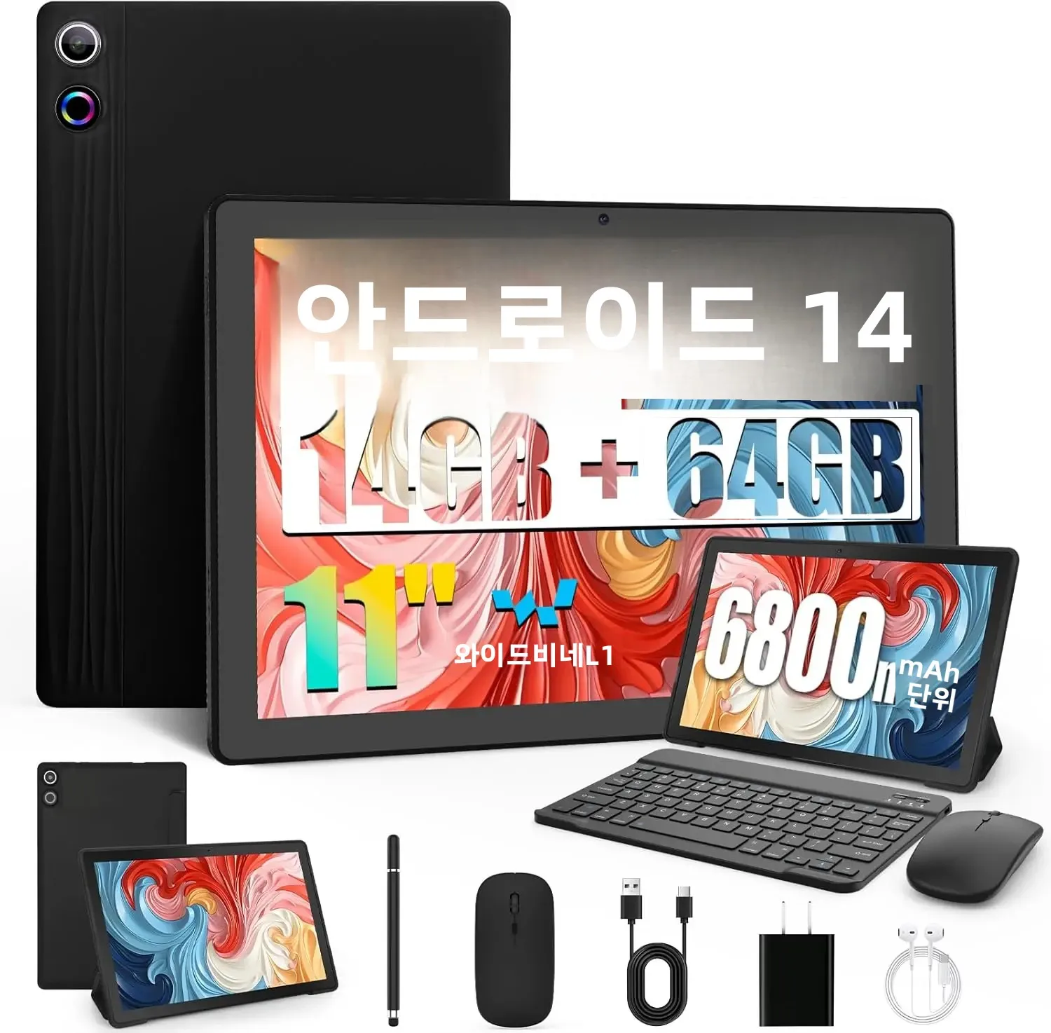 URAO 11인치 태블릿 안드로이드 14GB 램 64GB 롬 6800mAh IPS HD 터치스크린 키보드 보호 케이스 마우스 스타일러스 8 in 1 키트