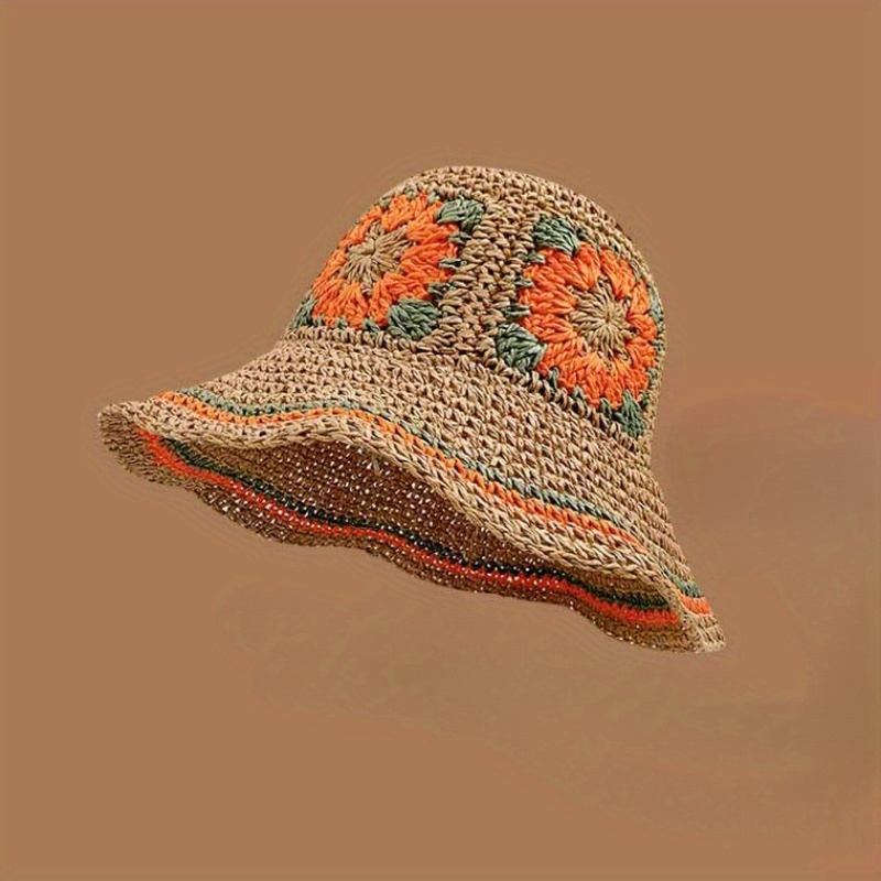 TEMU 스타일 패셔너블 핸드메이드 플로럴 스트로우 모자, 빈티지 컬러 블록 디자인과 가벼운 접이식 기능. 일상 착용, 야외 여행 또는 축제 파티에 완벽한 여성 선물