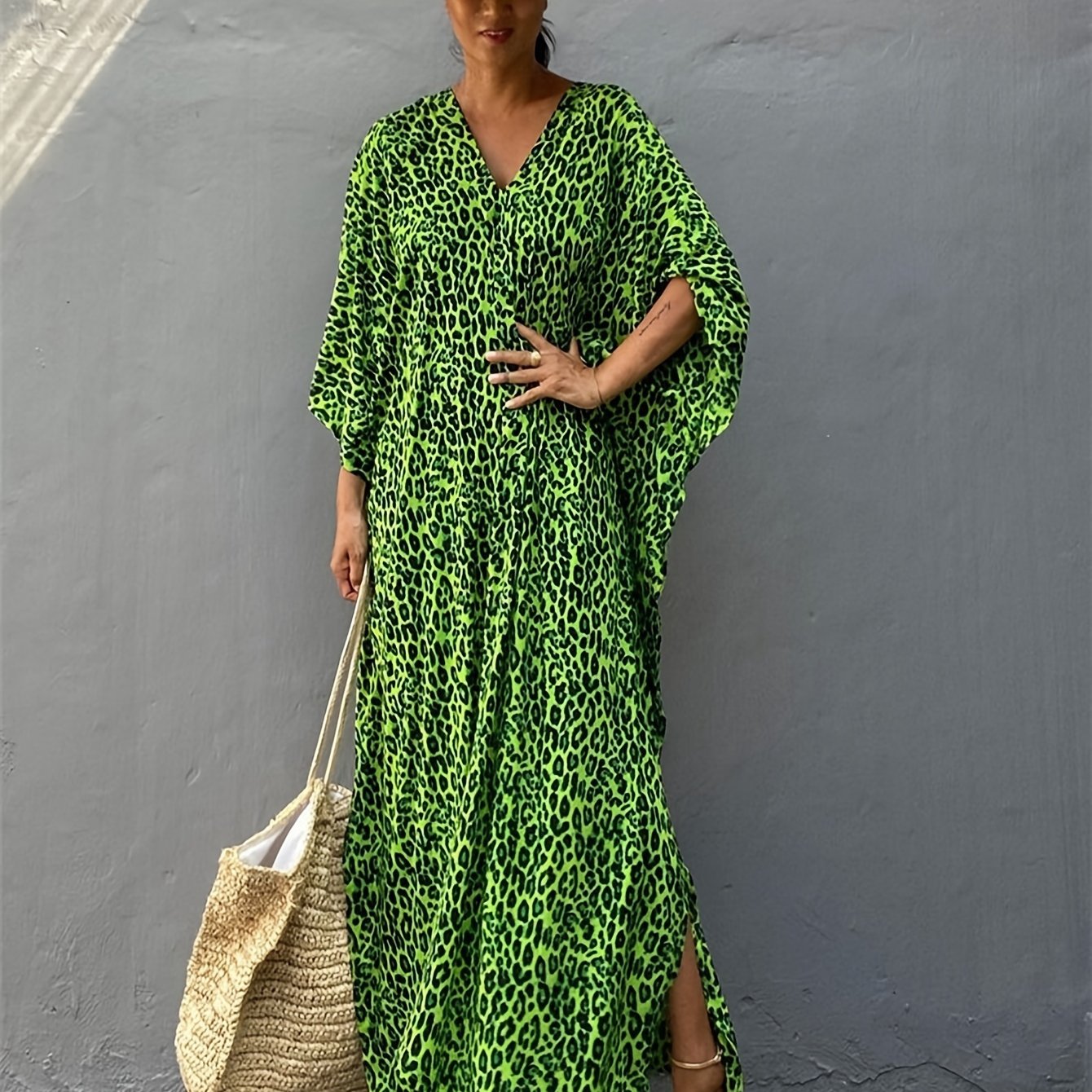 TEMU 플러스 사이즈 올오버 프린트 V넥 박쥐소매 루즈핏 맥시 커버업 카프탄 드레스, 여성 수영복 및 의류