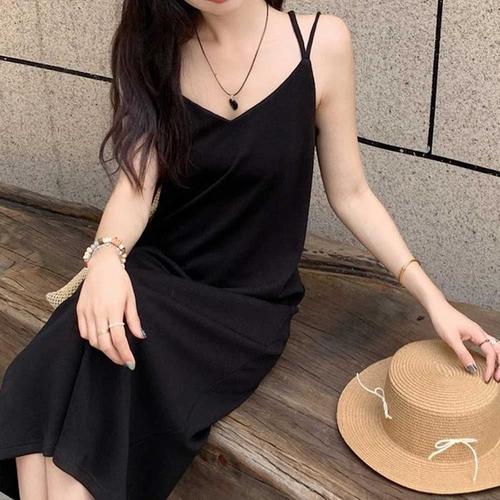 [BZJL9R3X_4C]여성 브이넥 끈나시 롱원피스 블랙 바캉스룩