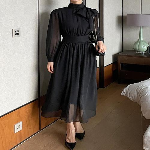 [예쎄](예쎄) 빅리본타이 포인트 하이넥 쉬폰 롱 원피스(S5WOP026A)